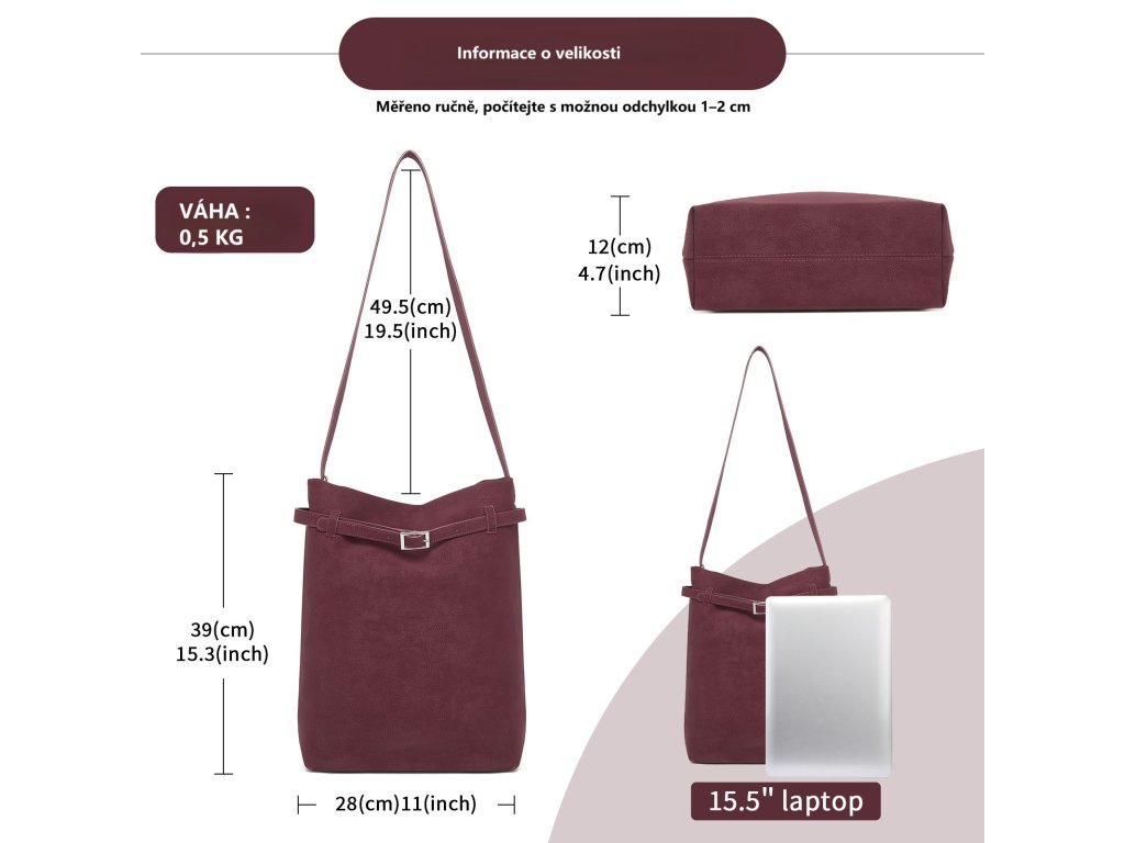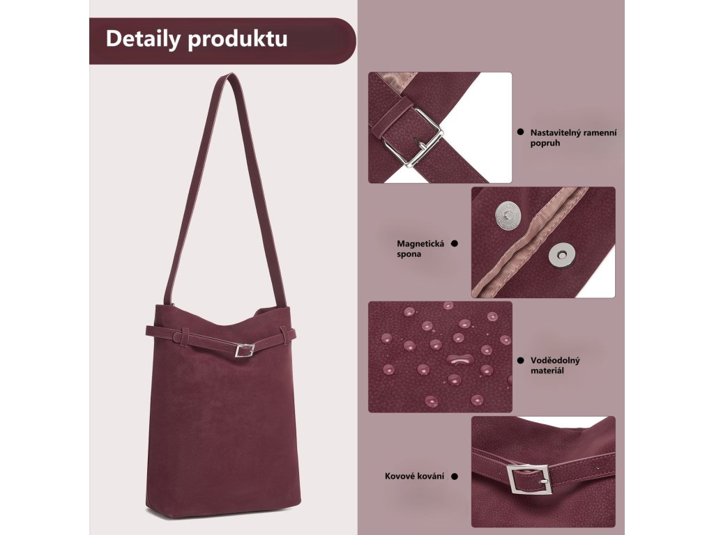 Kabelka je vyrobena z kvalitní PU kůže s jemnou texturou, která působí luxusně a zároveň se snadno udržuje. Vnitřní podšívka z pevného polyesteru chrání uložené věci a zajišťuje dlouhou životnost. Stříbrné kovové detaily ladí s hlubokým vínovým tónem a podtrhují její sofistikovaný vzhled. Povrch kabelky lze snadno vyčistit vlhkým hadříkem.