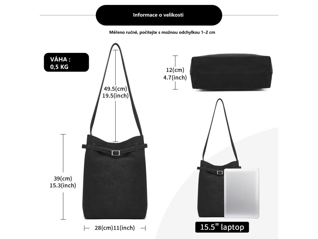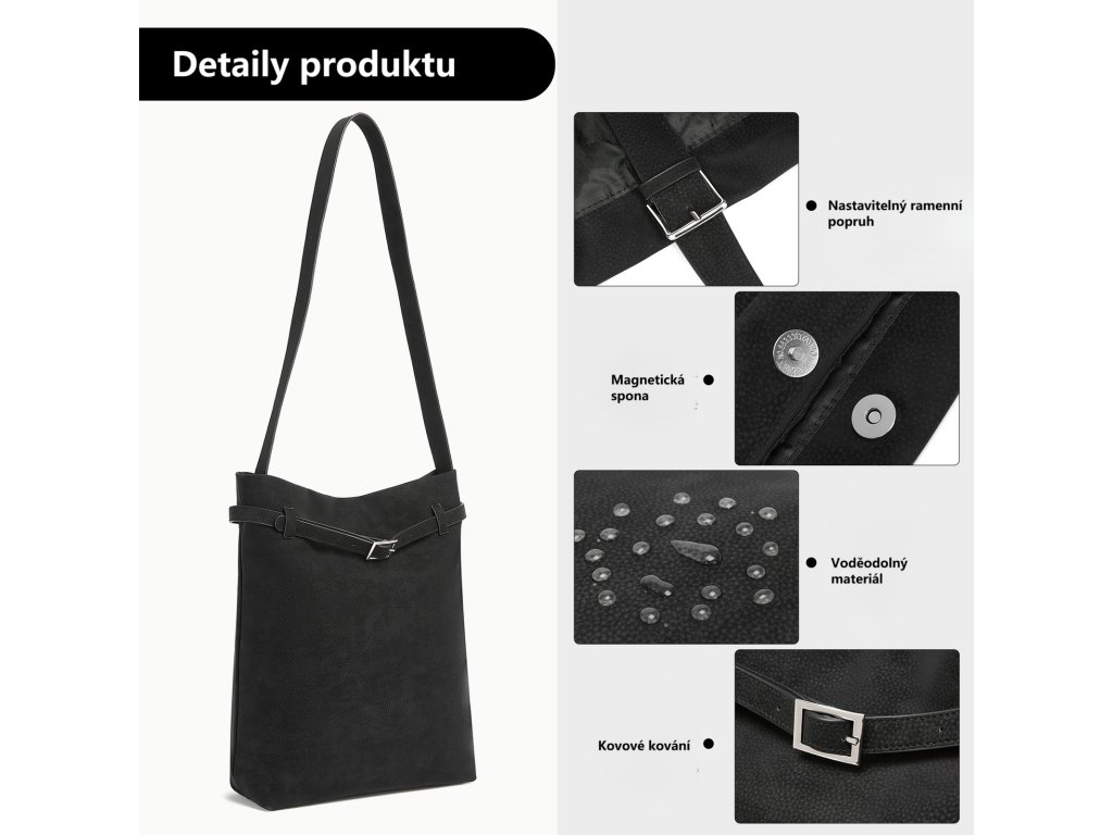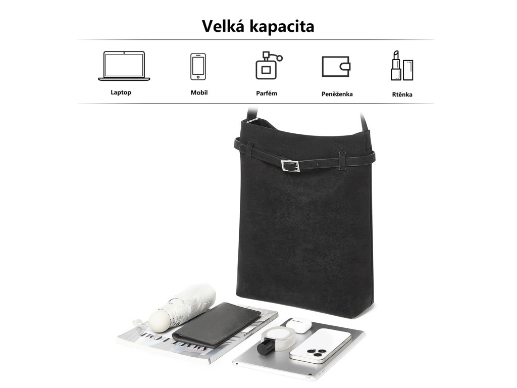 Ramenní popruh lze snadno přizpůsobit vaší výšce pomocí kovové přezky, takže kabelku můžete nosit buď pohodlně přes rameno, nebo jako crossbody. Lehká konstrukce o hmotnosti pouhých 0,5 kg zajišťuje pohodlí i při celodenním nošení. Dekorativní pásek vedený ze zadní části dopředu s kovovou sponou dodává kabelce originální vzhled, který zaujme na první pohled.