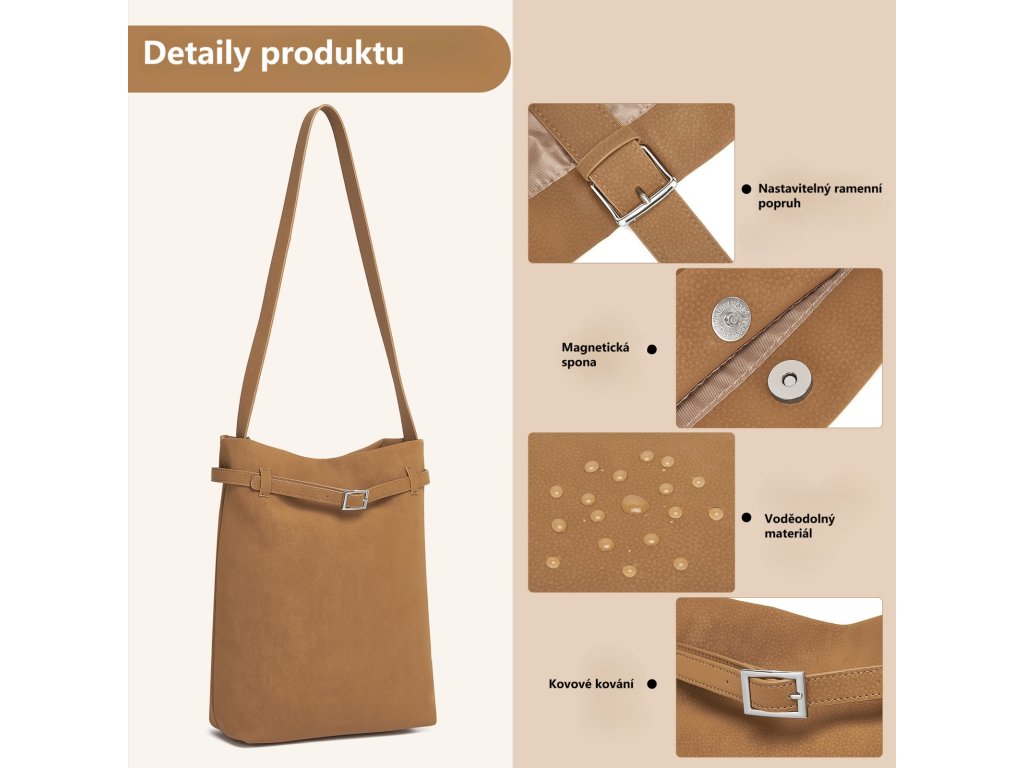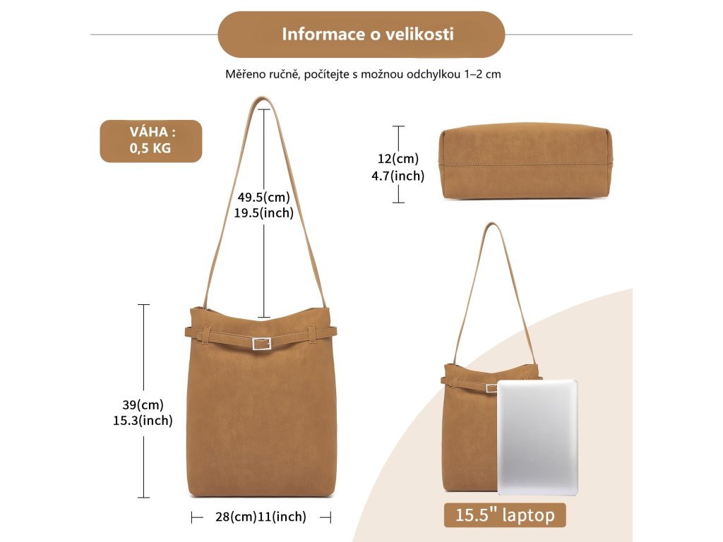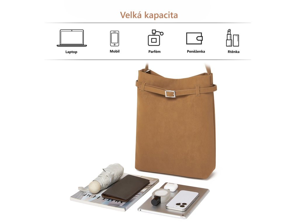 Nastavitelný ramenní popruh s ozdobnou kovovou přezkou umožňuje kabelku nosit buď přes rameno, nebo křížem přes tělo. Ergonomický tvar a lehká konstrukce (pouze 0,5 kg) zajišťují maximální komfort i při celodenním nošení. Dekorativní řemínek vedený z přední na zadní část přidává modelu originální detail, který zaujme na první pohled.