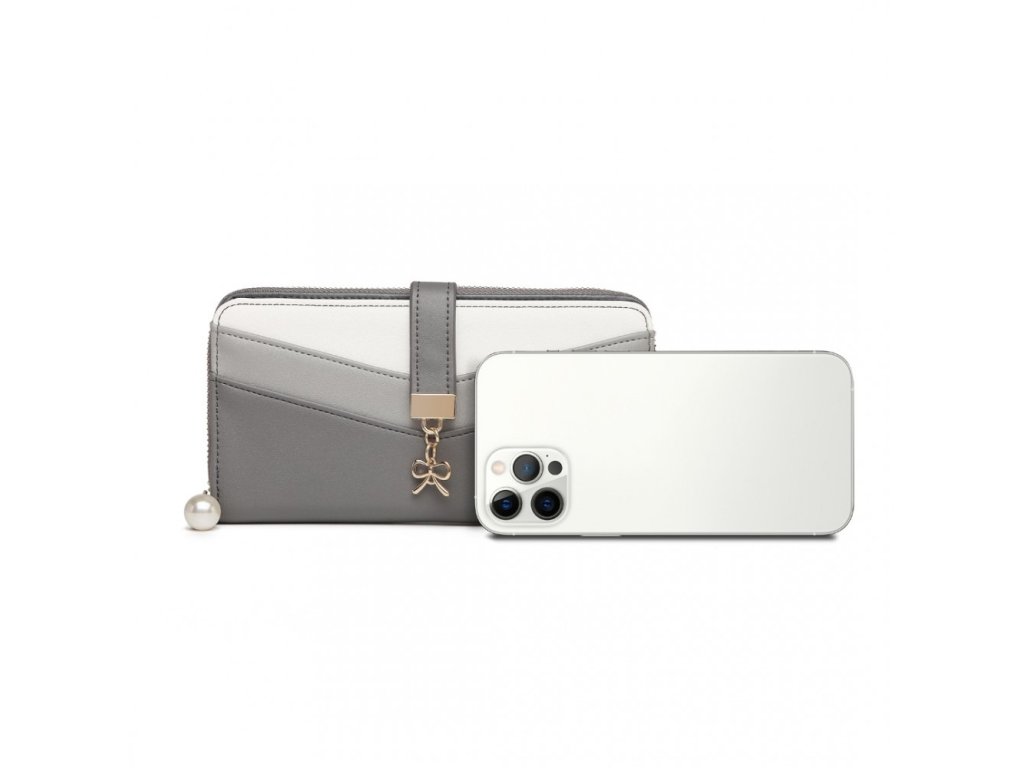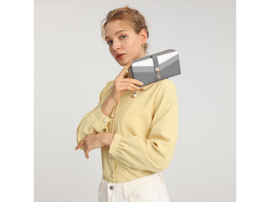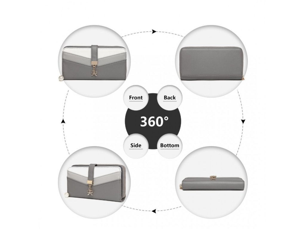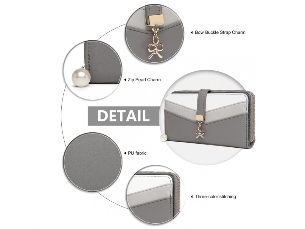 Rozkošná dámská peněženka v šedém provedení v kombinaci s bílou a světle šedou a měděnými doplňky.
