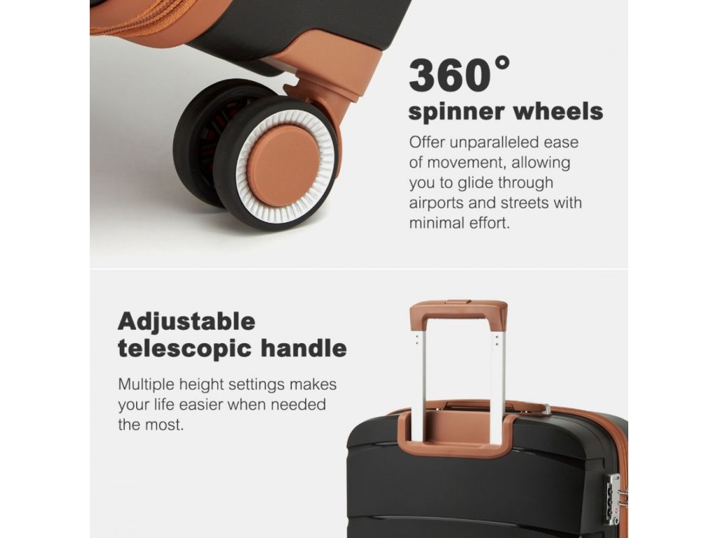 Díky odolnému polypropylenu a nadčasové černo-hnědé barevné kombinaci je kufr Kono skvělým partnerem pro každého cestovatele. Zajistí bezpečí vašich věcí, snadnou manipulaci a moderní vzhled při každém vašem dobrodružství. ✈️💼