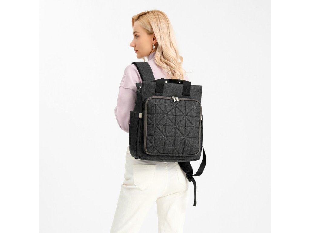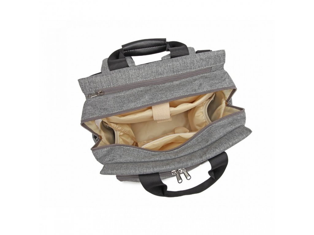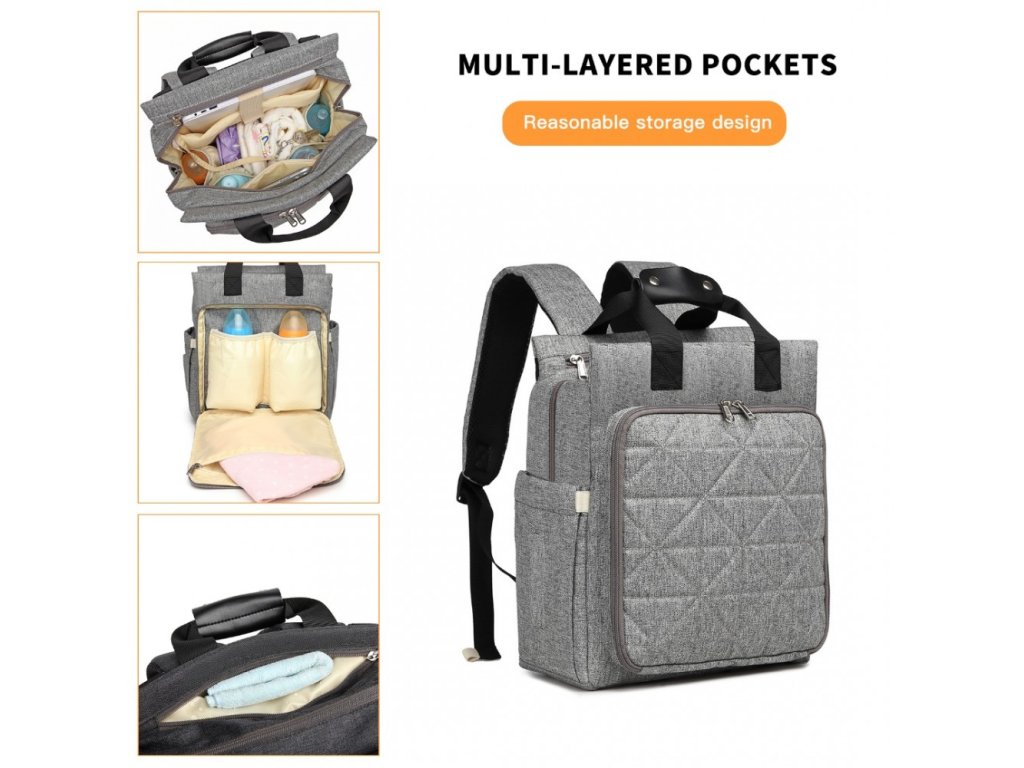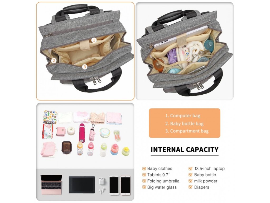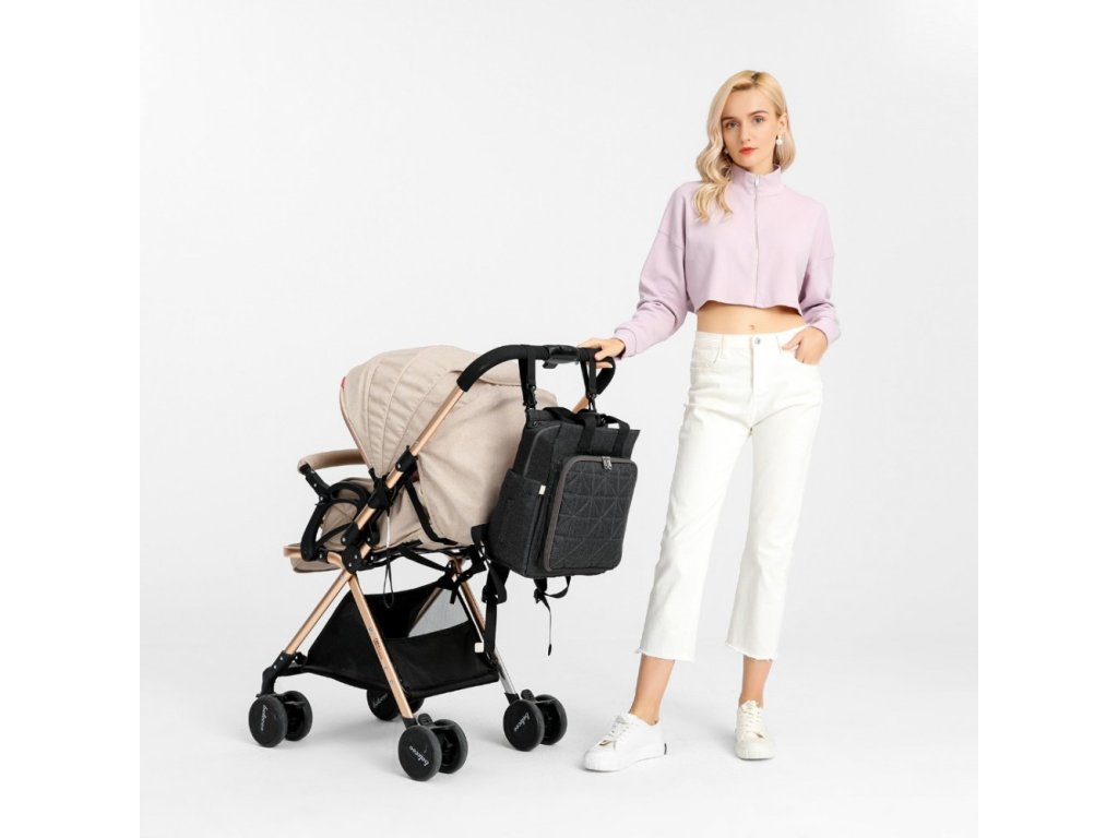 Vybaven dvěma izolovanými držáky na láhev, kapsou na kapesníky, horní kapsou na ručníky, popruhy na kočárek a velkým hlavním prostorem s více přihrádkami, lze jej použít jako cestovní batoh, batoh nebo tašku na kočárek.