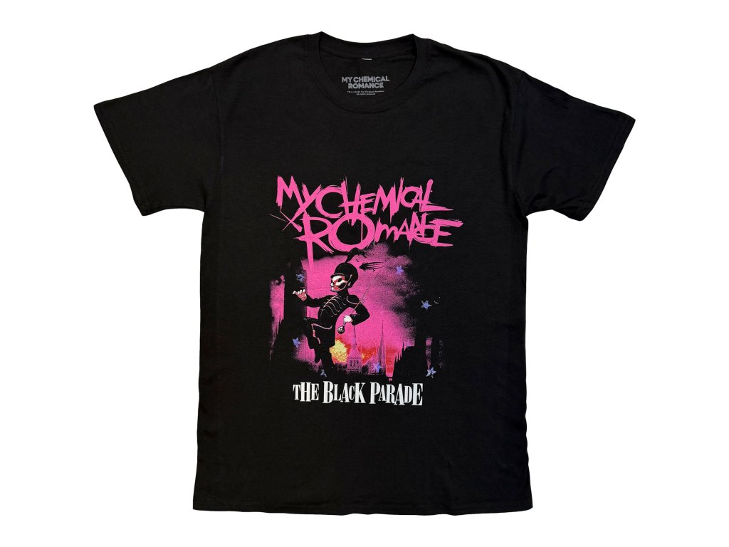 Přední stranu trička zdobí ikonický motiv „March“ inspirovaný albem The Black Parade. Živá kombinace černého podkladu, růžového loga a detailního grafického motivu vytváří silný vizuální efekt, který okamžitě upoutá pozornost.
