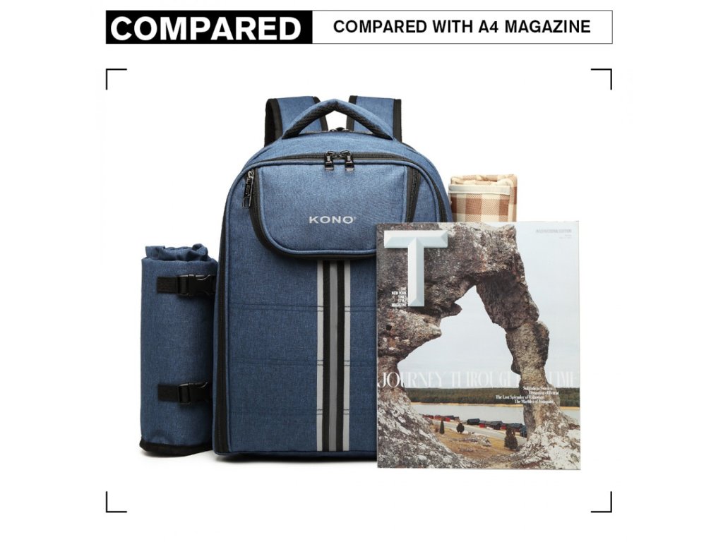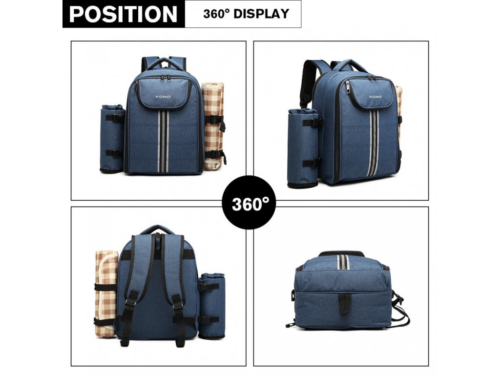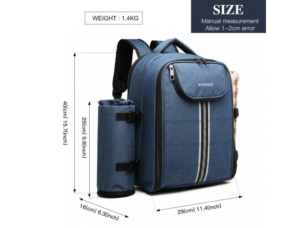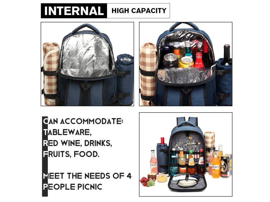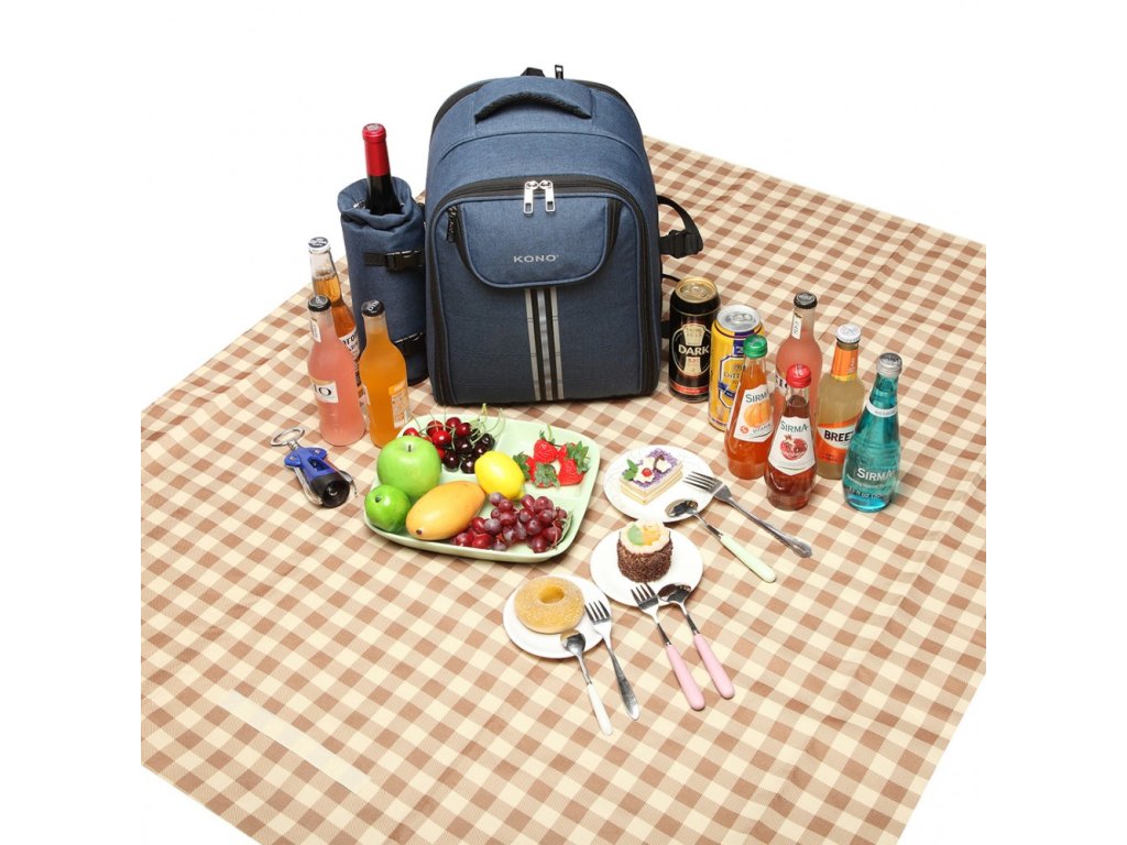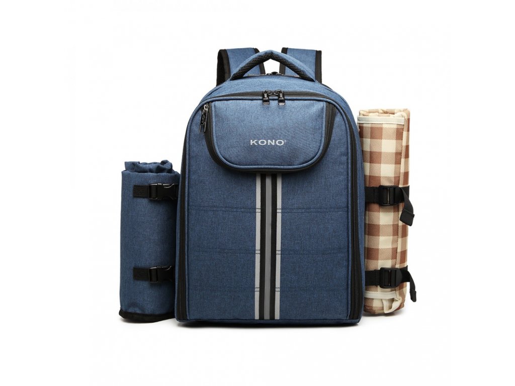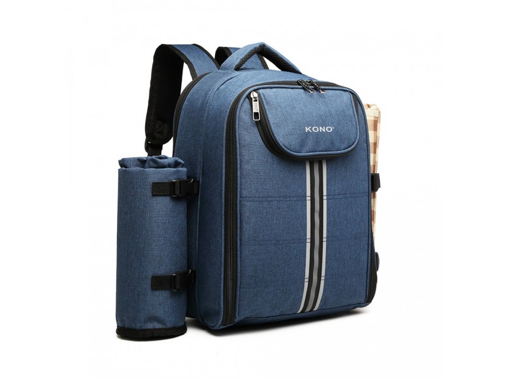 Perfektní batoh na piknik v přírodě, s nepromokavou podložkou a termoobalem na lahev vína či limonády. V modrém provedení.