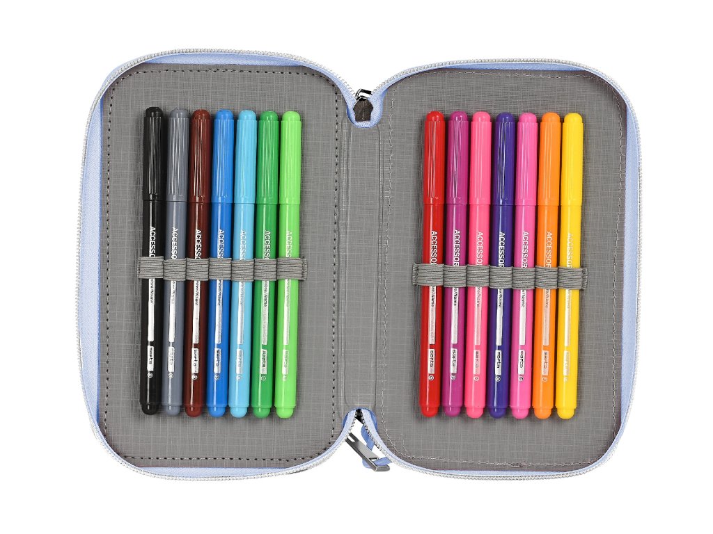 - 27 kusů psacích potřeb: 1x gumu, 1x grafitovou tužku, 1x modré pero, 1x černé pero, 1x ořezávátko, 12 barevných tužek a 10 barevných fixů.