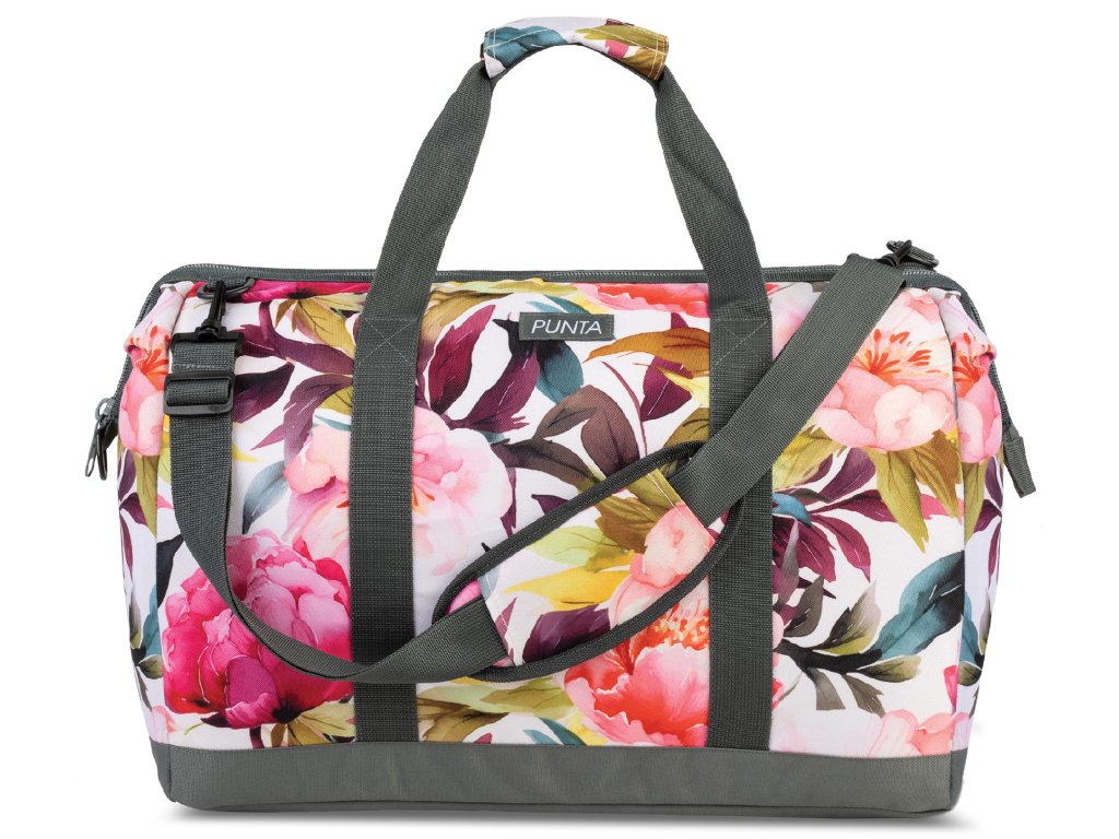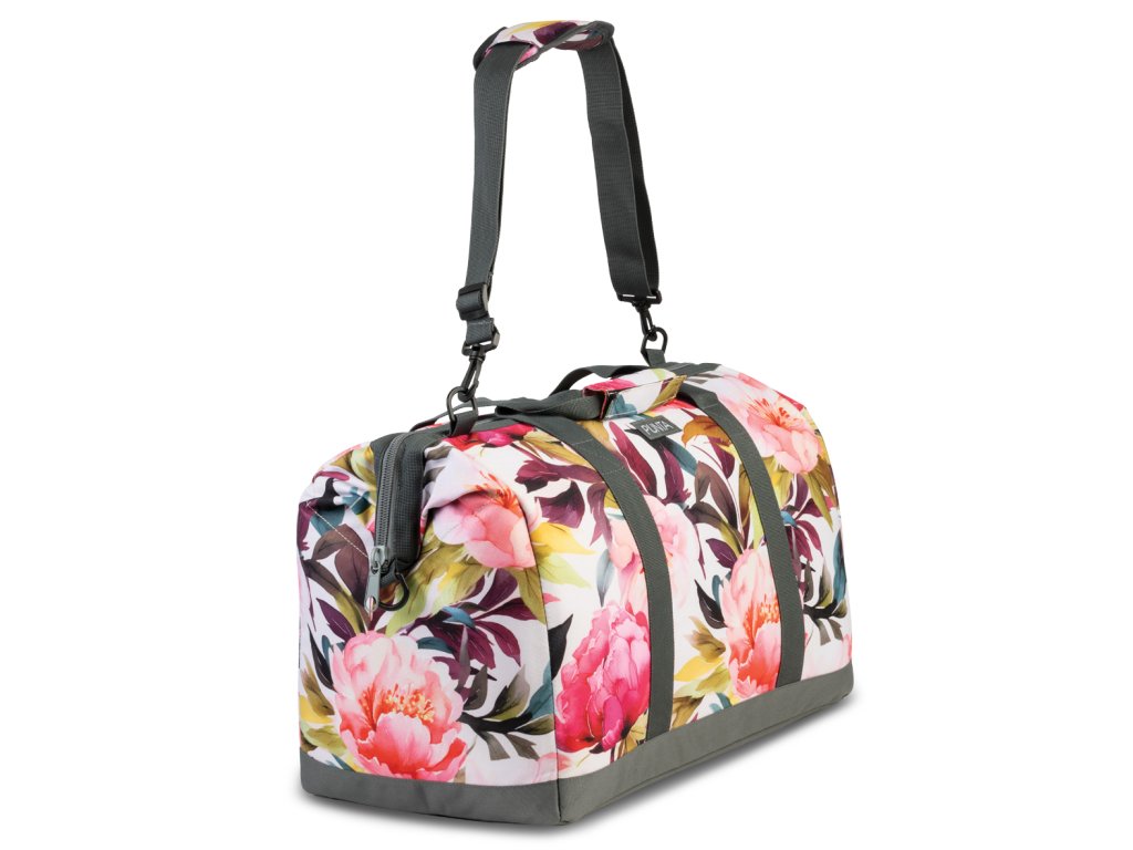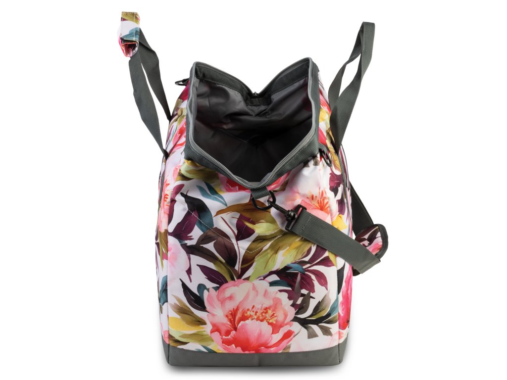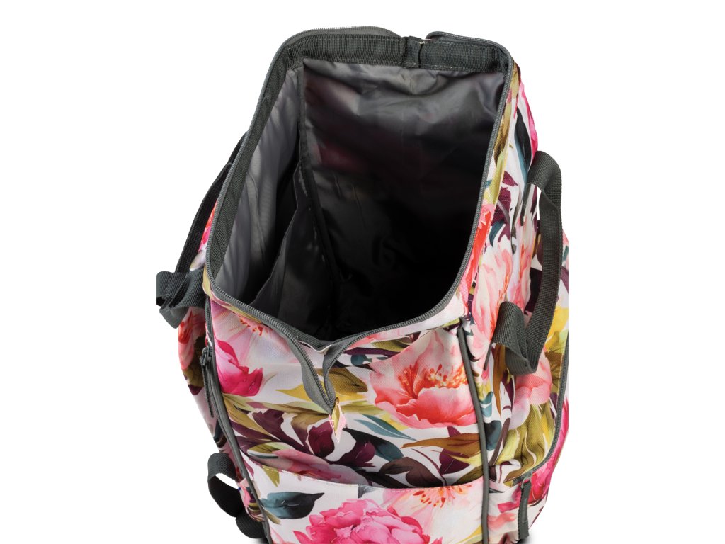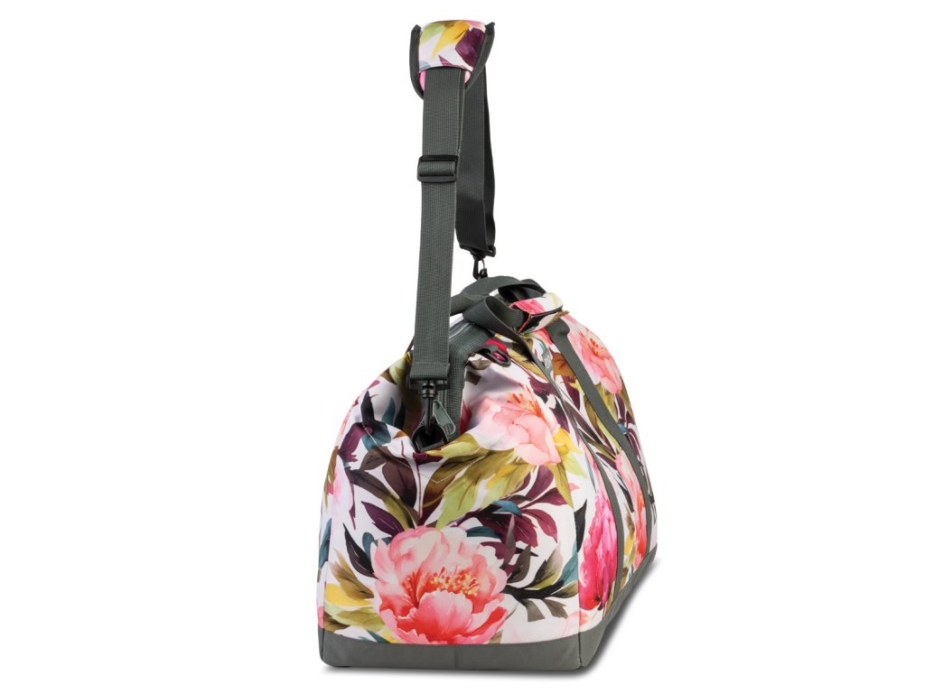 Taška je navržena ve světlé bílé barvě s výrazným květinovým vzorem – pivoňky v odstínech růžové, korálové a fuchsiové doplňují zelené a olivové listy. Šedé popruhy a detaily ladí s potiskem a podtrhují moderní, svěží charakter. Energický motiv rozzáří letní outfity a skvěle se hodí na dovolenou, víkend i do města.