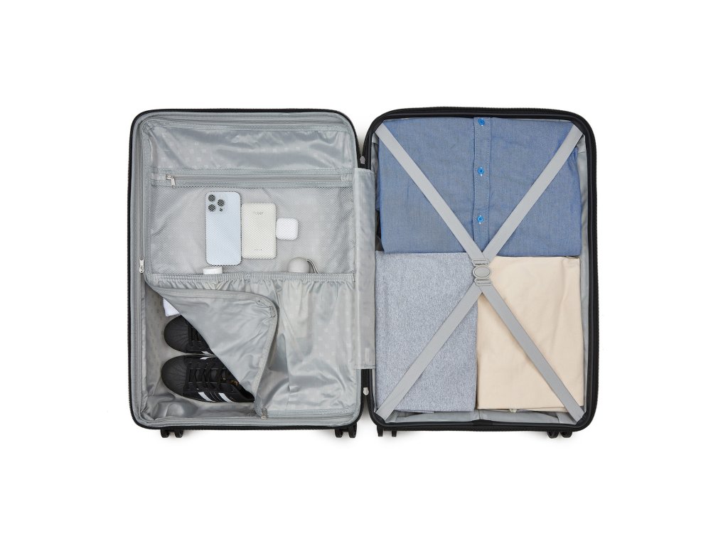 Vnitřní prostor kufru nabízí promyšlené uspořádání pro snadnou organizaci věcí. Jedna strana je vybavena síťovanou kapsou a menšími přihrádkami na doplňky, druhá strana má křížové popruhy pro fixaci oblečení. I při plném naplnění zůstává obsah kufru přehledný a oblečení zůstává úhledně složené bez zbytečných záhybů.
