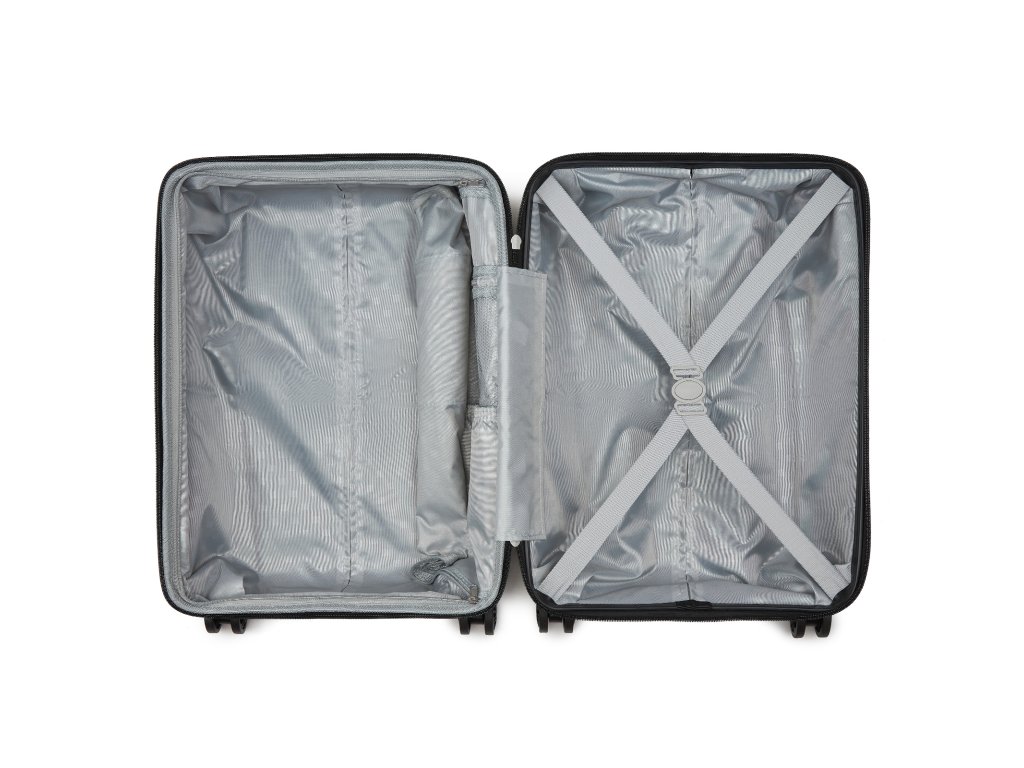 Vnitřní prostor kufru je rozdělený tak, aby nabízel maximální přehlednost a pohodlí při balení. Jedna strana je vybavená síťovanou kapsou a menšími přihrádkami na doplňky, druhá strana má křížové popruhy, které pevně drží oblečení na místě. I při plném naplnění zůstává obsah úhledný a bez zmačkání.