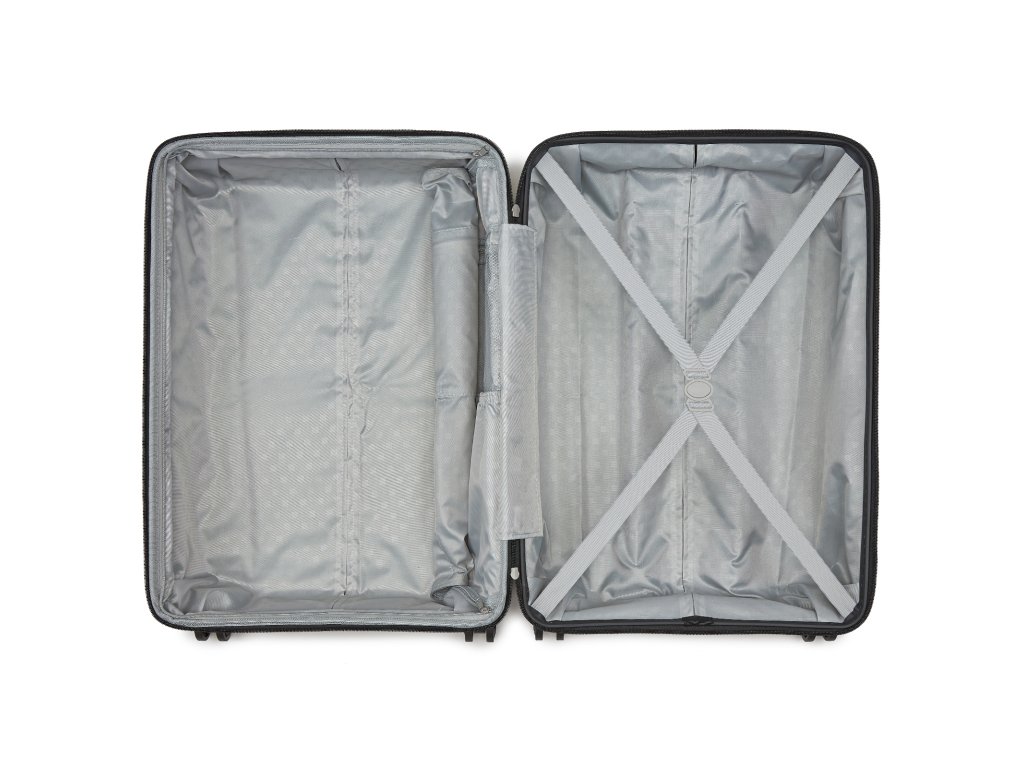 Vnitřní prostor kufru je rozdělený tak, aby nabízel maximální přehlednost a pohodlí při balení. Jedna strana je vybavená síťovanou kapsou a menšími přihrádkami na doplňky, druhá strana má křížové popruhy, které pevně drží oblečení na místě. I při plném naplnění zůstává obsah úhledný a bez zmačkání.