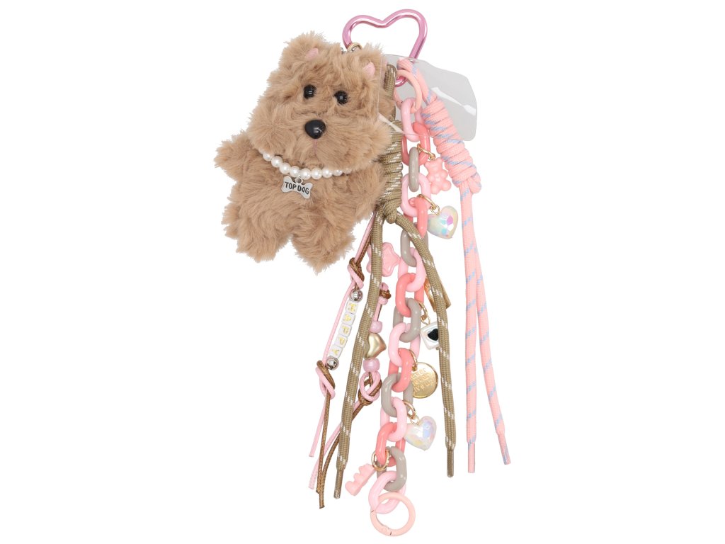 Přívěsek zdobí různé barevné provázky, plastové řetízky, srdíčka, korálky i drobné přívěsky, které dohromady tvoří originální a veselý celek. Díky praktické karabince ve tvaru srdce ho snadno připnete na klíče, batoh nebo tašku.