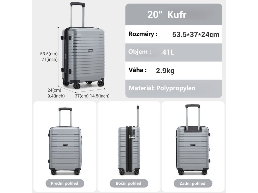 - 20" model: 53,5 cm (V) x 37 cm (Š) x 24 cm (H), hmotnost 2,9 kg, objem přibližně 41 l