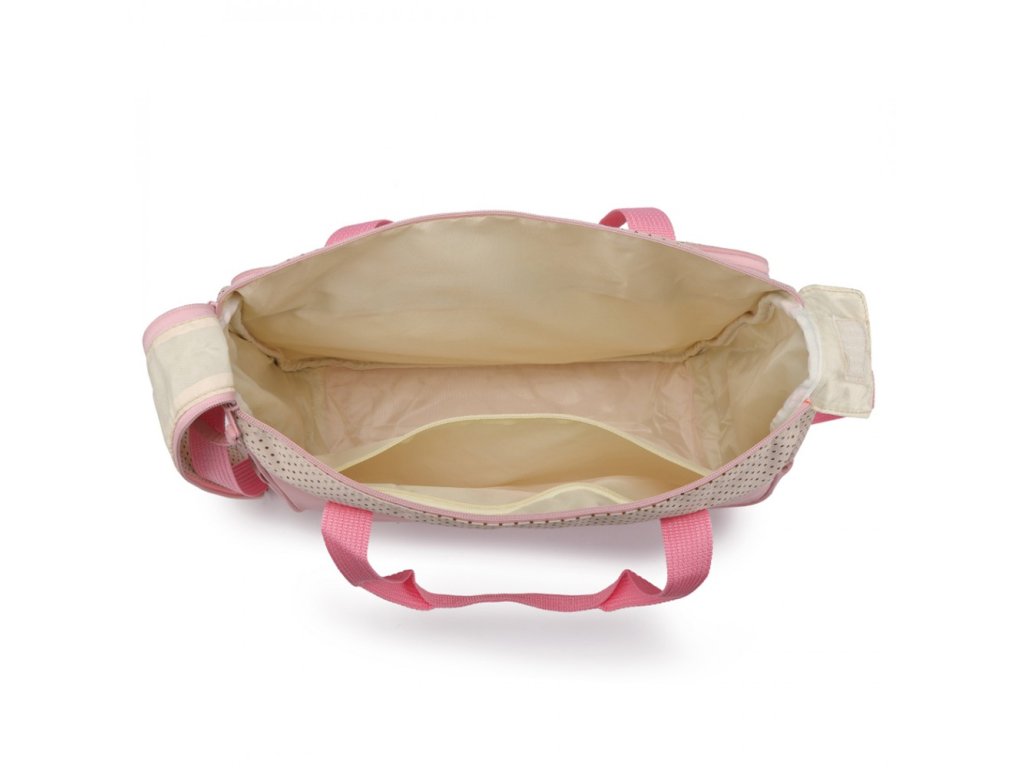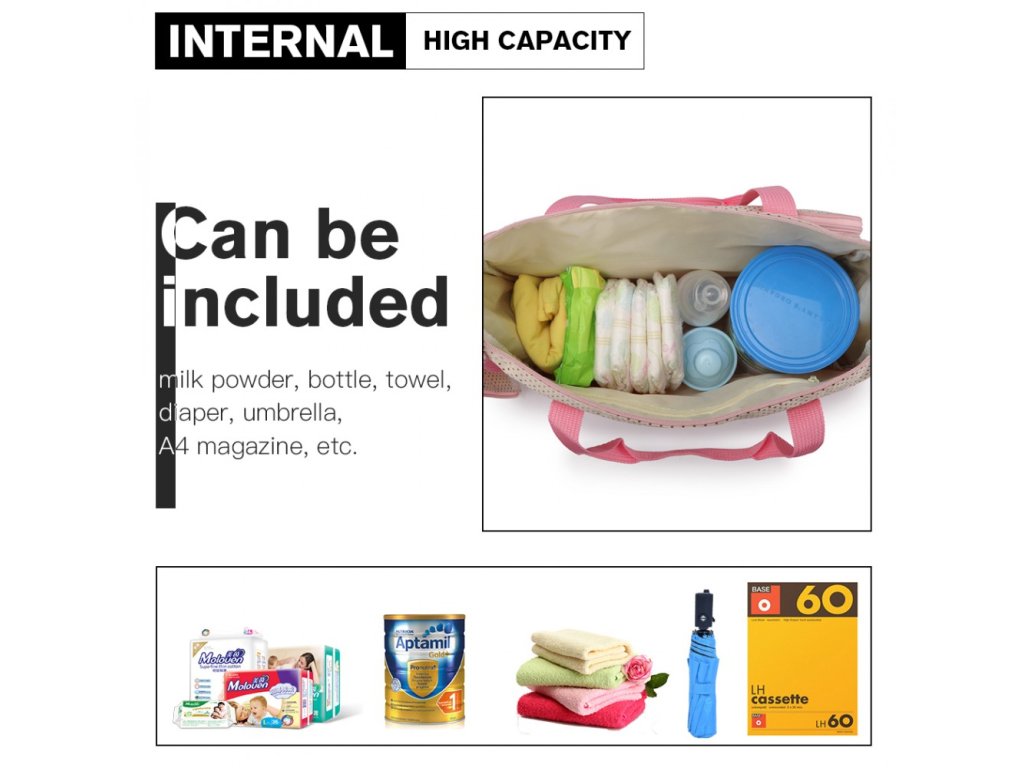 Tašky pojmou mléko, flaštičky, plenky, ručníky, vlhčené ubrousky, časopis do velikosti A4 a vše co aktuálně potřebujete.
