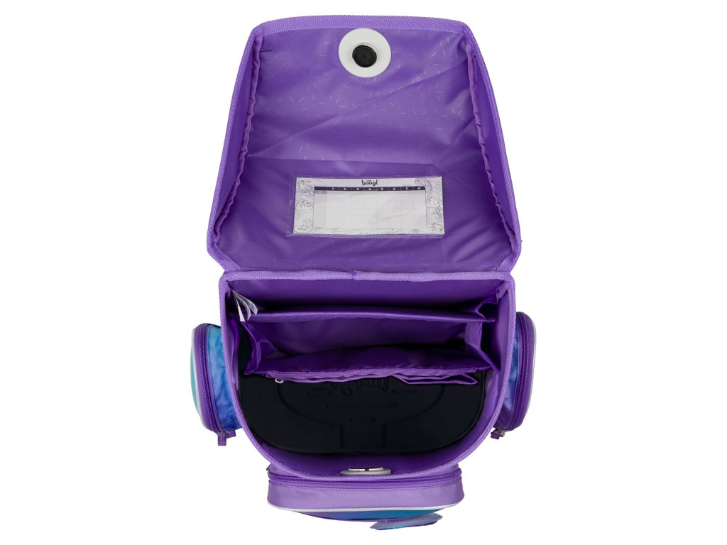 - Vnitřní organizér s kapsou na rozvrh a stahovacím popruhem pro stabilizaci těžkých učebnic.