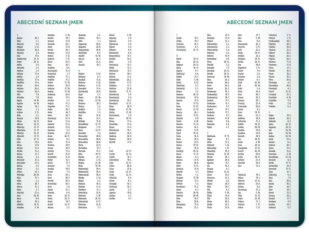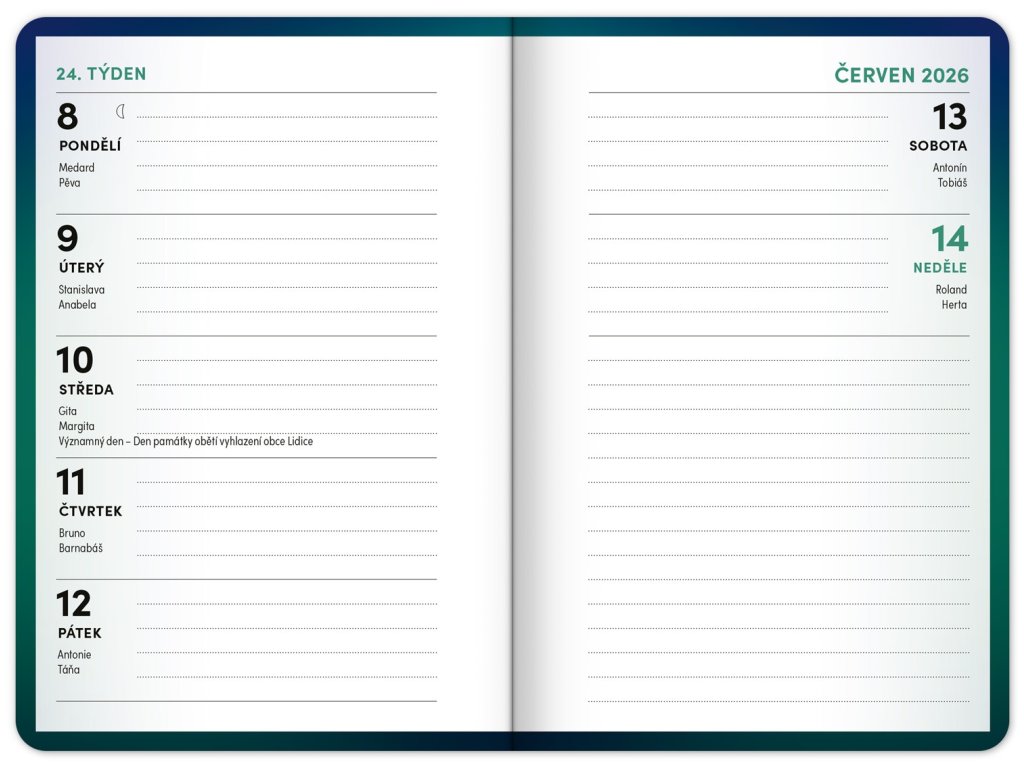 - České týdenní řádkové kalendárium se jmény a svátky.