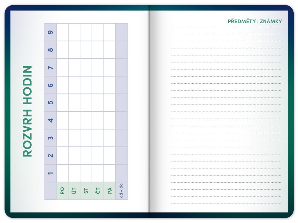 - 🕒 Vlastní rozvrh hodin: Přehledný prostor pro vyplnění rozvrhu pomáhá dětem udržet pořádek ve školních dnech.