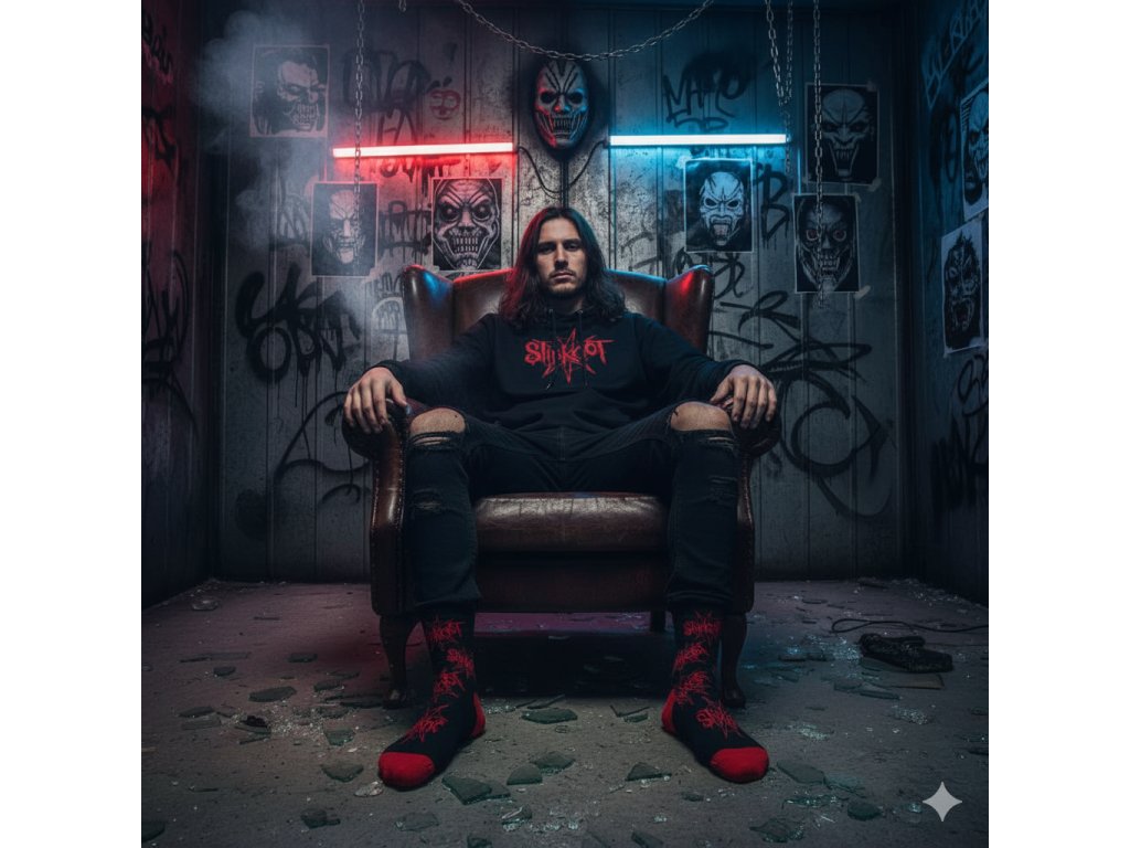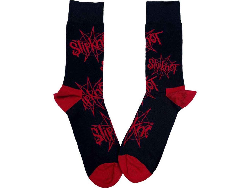 Červené logo Slipknot a nonagram jsou umístěny zepředu i zezadu, takže motiv vynikne při každém kroku. Červená pata a špička dodávají ponožkám výrazný kontrastní vzhled. Skvěle doplní koncertní outfit nebo každodenní streetwear styl.