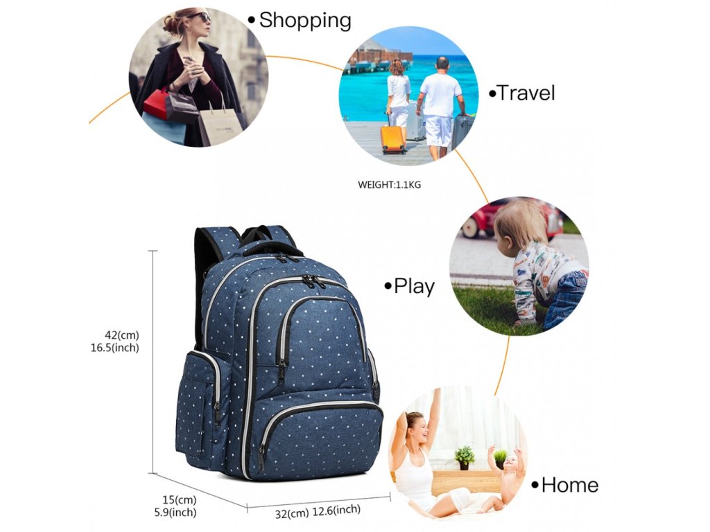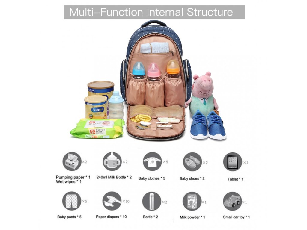 Obsahuje množství kapes a složek, ve kterých prostě najdete vše co právě potřebujete, termosku, láhev, krabičku s jídlem, pleny, vlhčené ubrousky, hračky atd ...