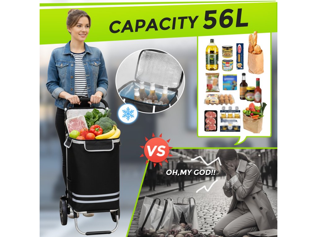 - 🛒 Velký objem 56 l: Prostorná hlavní přihrádka pojme celý týdenní nákup nebo větší náklad z trhu.