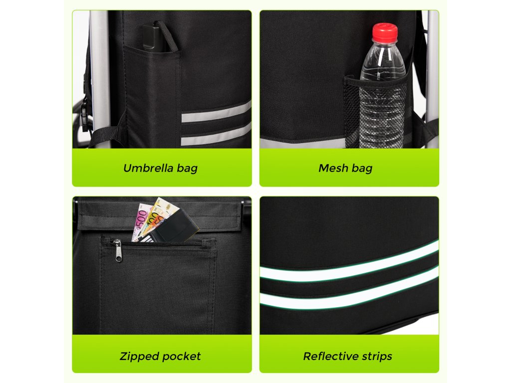 - 🔧 Pevný hliníkový rám: Stabilní konstrukce s nosností až 50 kg zajišťuje bezpečnou přepravu i těžkého nákupu.