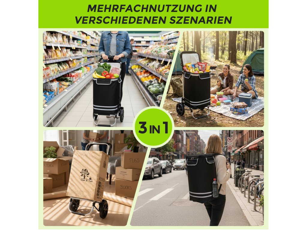 - 🎒 Funkce 3v1: Lze používat jako nákupní vozík, batoh nebo samostatný ruční vozík na přepravu krabic a těžkých balení.