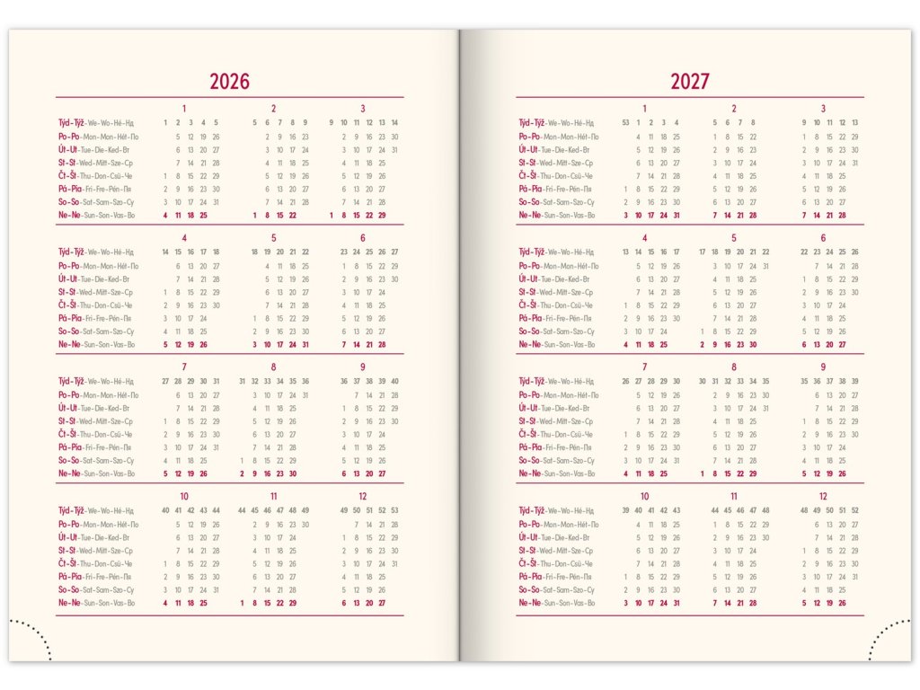 - 📅 Týdenní přehlednost: Rozložení týden na dvou stranách umožňuje mít všechny úkoly, schůzky a poznámky přehledně na jednom místě.