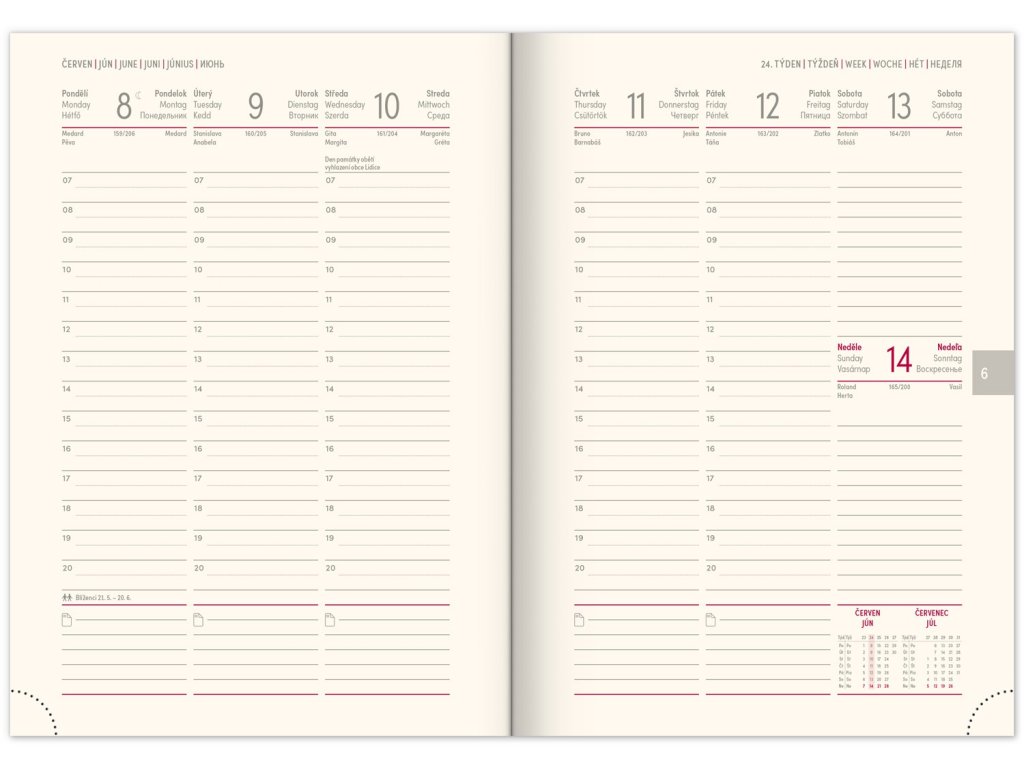 - 🌍 Šestijazyčné kalendárium: Kompletní česko-slovenské kalendárium doplněné o angličtinu, němčinu, maďarštinu a ruštinu.