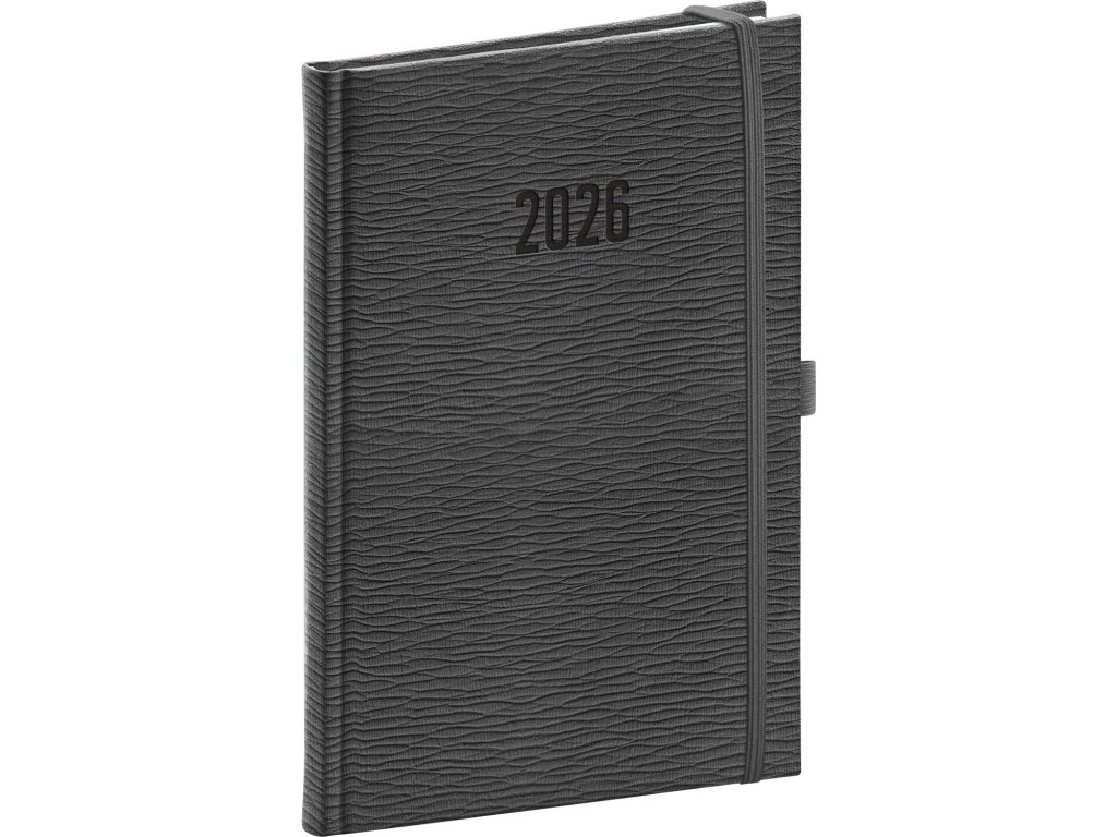 - 📘 Atypický povrch: Moderní struktura v šedém tónu dodává diáři profesionální a čistý vzhled.