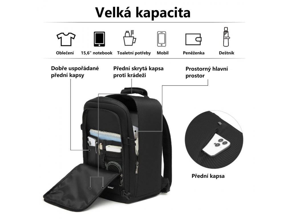 - 🧳 Balení jako do kufru: Hlavní komora se otevírá dokořán pro 100% přehlednost.