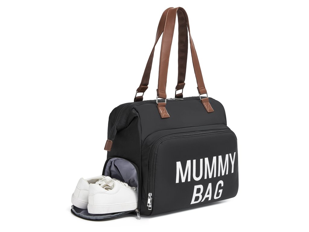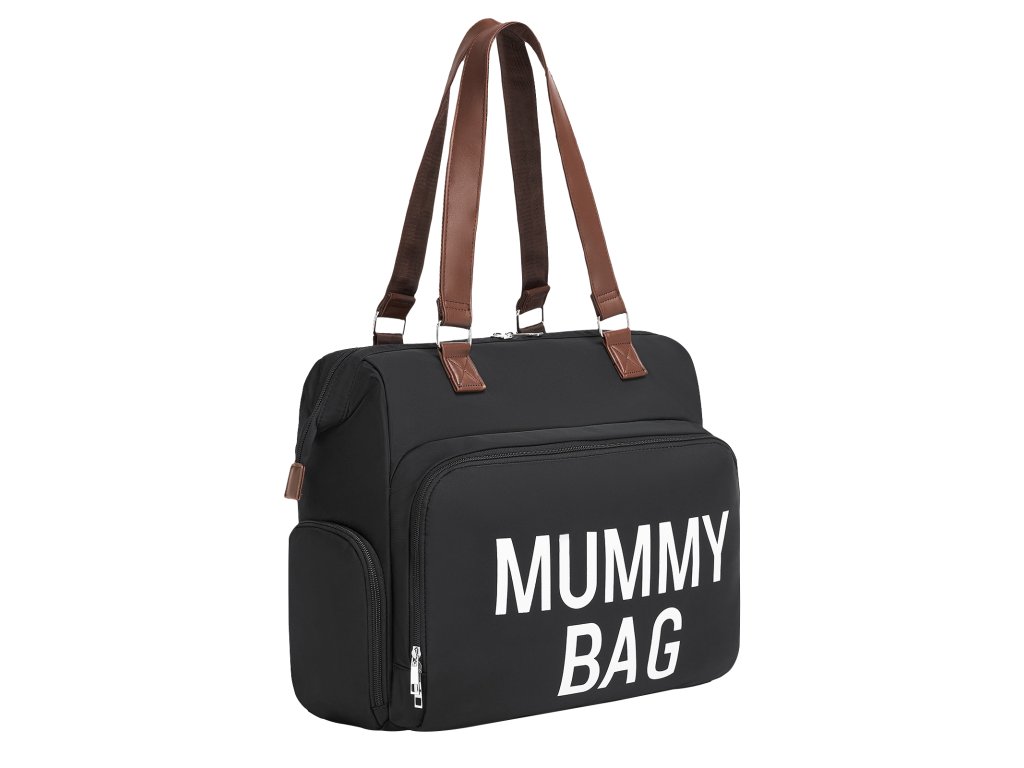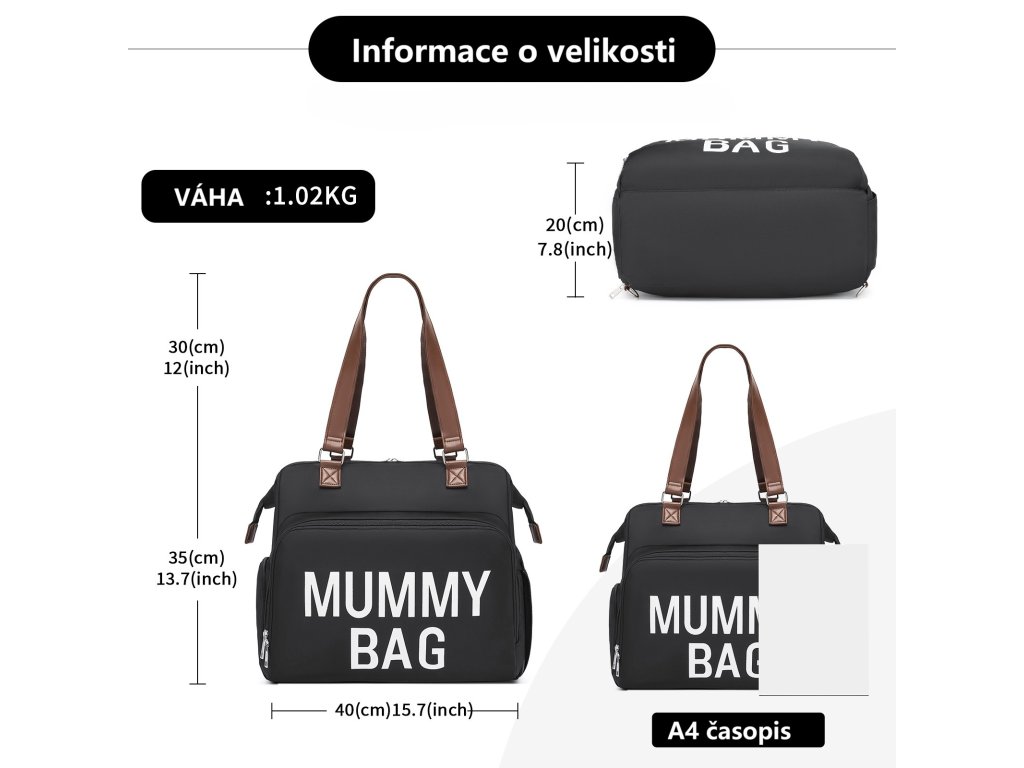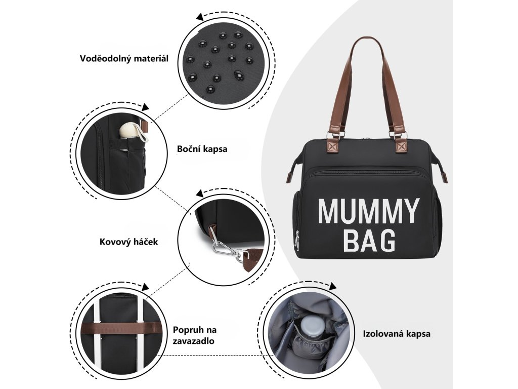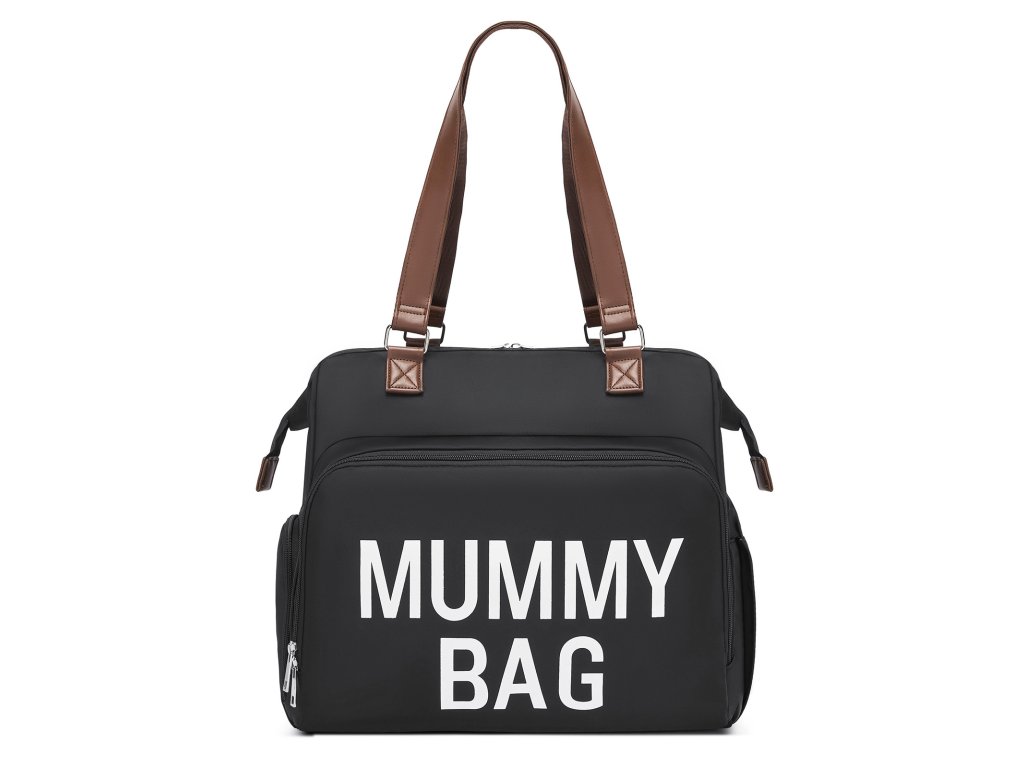 Kombinace černého materiálu s hnědými detaily a nápisem MUMMY BAG působí moderně a stylově. Tato taška spojuje funkčnost s módním vzhledem, takže se stane vaším oblíbeným doplňkem nejen při péči o dítě, ale i na cestách nebo v práci.