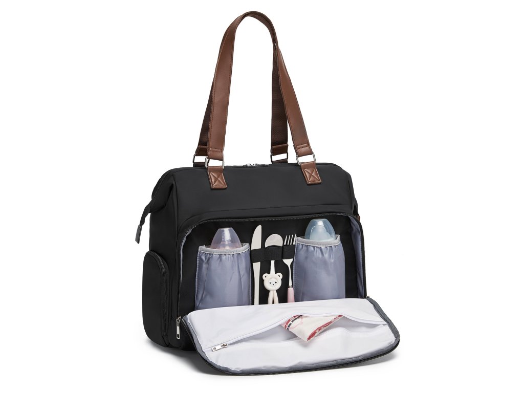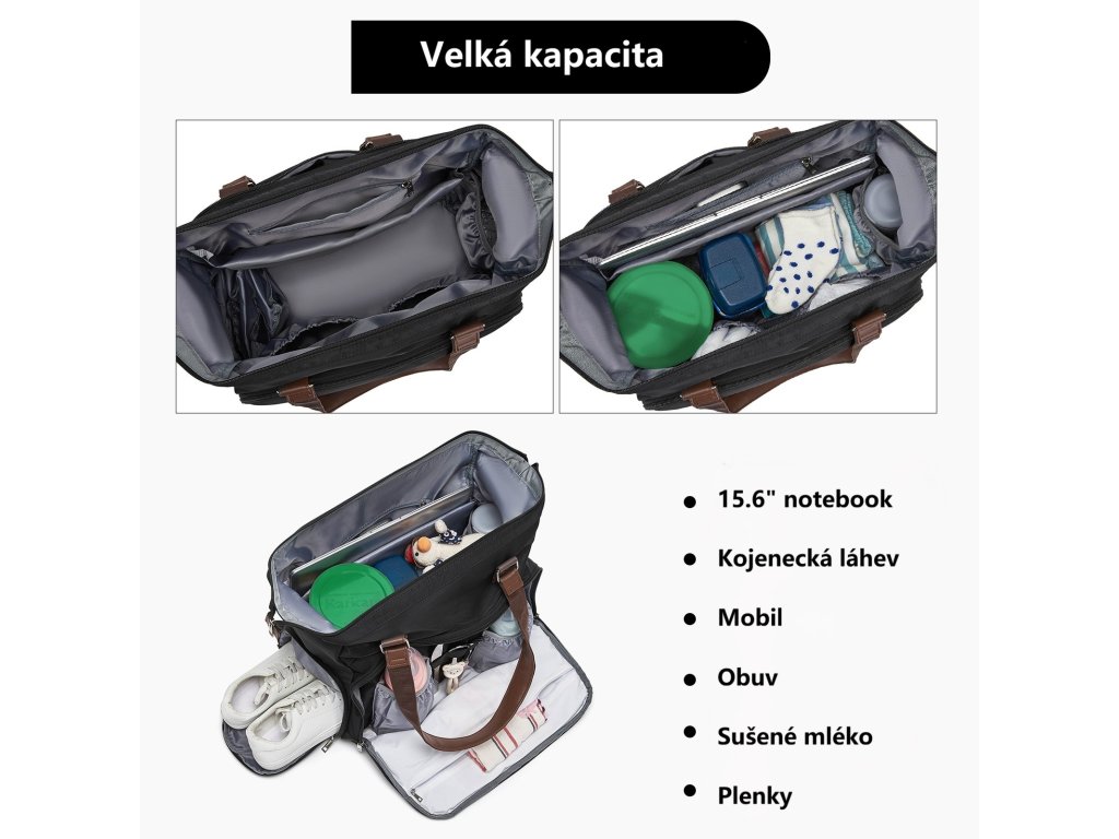 Prostorná a praktická - pojme veškeré potřeby pro miminko i osobní věci, jako je peněženka, telefon, oblečení či kosmetika. Díky své velikosti pojme i dokumenty formátu A4 nebo notebook do 15".