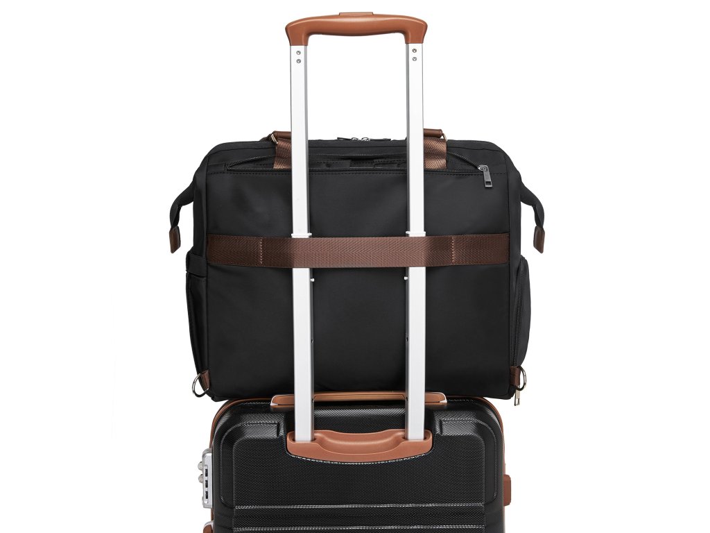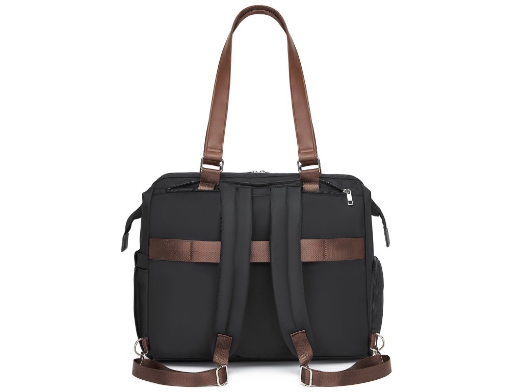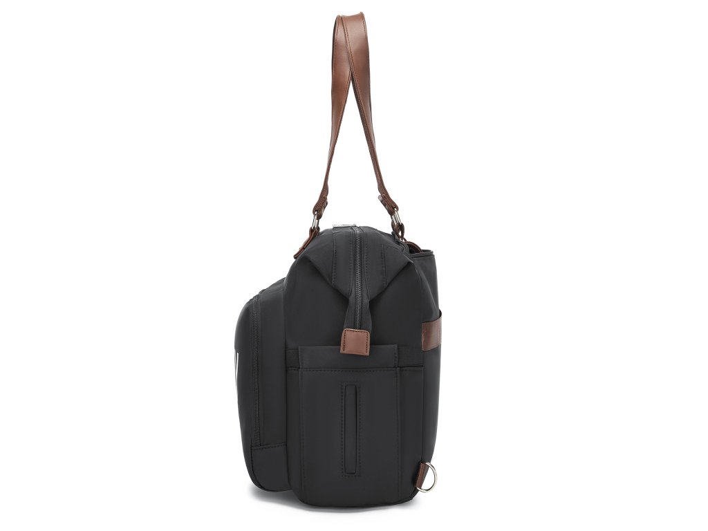 Tašku můžete nosit v ruce, přes rameno nebo jako batoh. Nastavitelné popruhy se snadno přizpůsobí a v případě potřeby lze háčky elegantně schovat do zadní kapsy. Součástí je také pásek pro uchycení na kufr a dva popruhy pro připevnění ke kočárku – ideální pro cestování i procházky s dětmi.