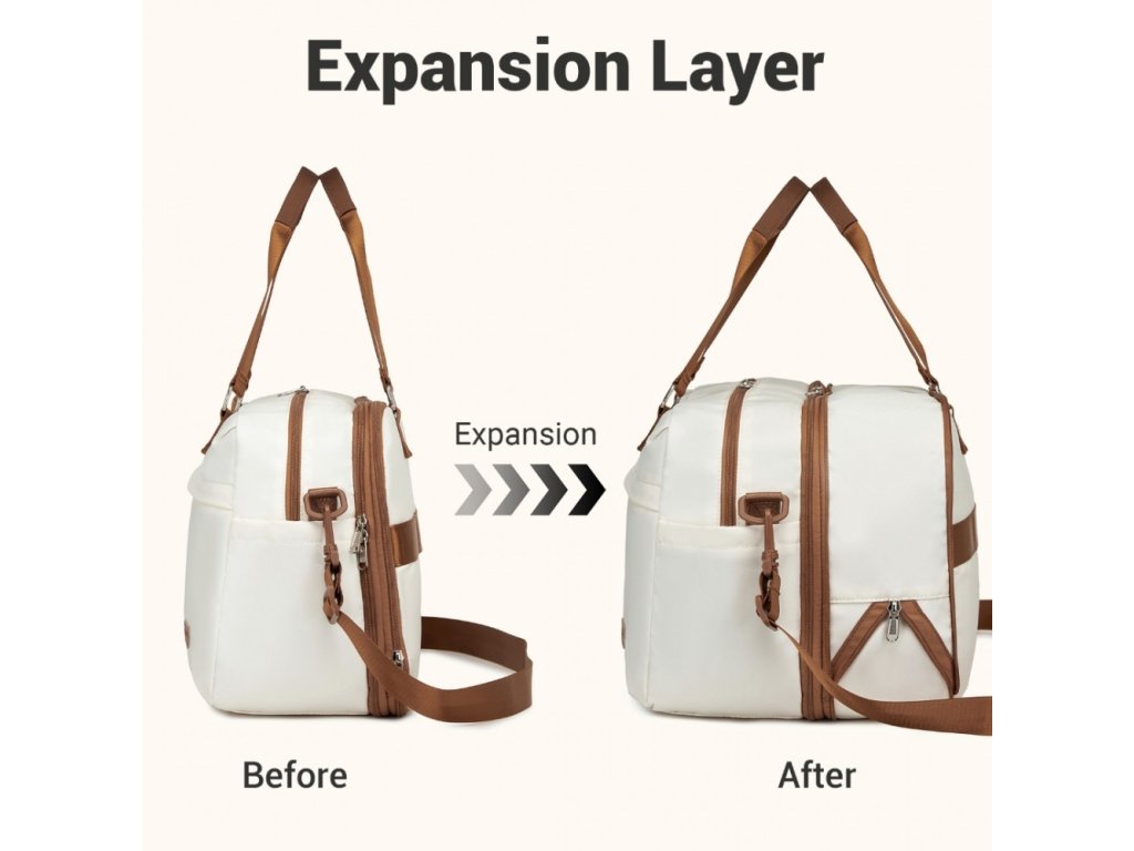 - Rozšiřitelný spodní prostor: Zadní přihrádka s oddělením pro mokré a suché věci a popruhem pro upevnění oblečení.